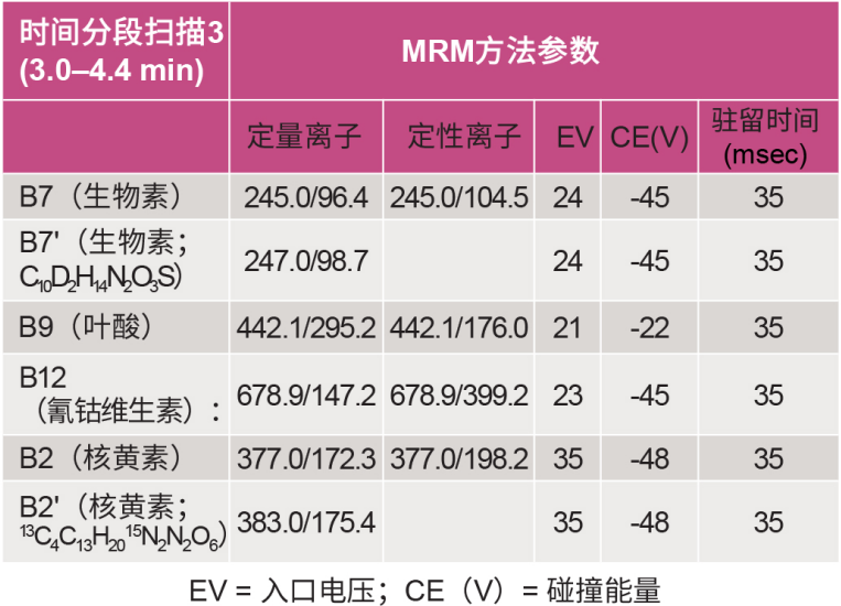 為了校準和定量,使用了三個內標:維生素 B1"(硫胺素;?13C4?C8?H17? N4?OS+)、B7"(生物素;?C10?D2?H14? N2?O3? S) 和 B2'(核黃素;?13C4?C13?H2015? N2? N2?O6?)),全部來自 Sigma-Aldrich Inc.。校準 B3、B3*、B6 和 B1 時采用 B1',校準 B7、B9 和 B12 時采用 B7,校準 B2 時采用 B2。?