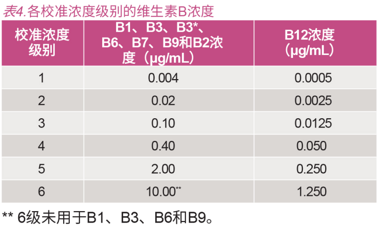 通過對工作標準品進行連續稀釋,制備 6 個校準濃度級別。獲得的維生素濃度見表 4。由于維生素 B12 的 DV 指南值明顯較低 (0.006mg),因此使用較低的濃度范圍對其進行校準。每批樣品運行前,分別移取各校準濃度級別標準溶液 50mL 至 50mL 容量瓶中,加入 50μL ISTD B1、B2 和 250μL ISTD B7,使內標濃度為 0.1ug/mL。注:如果可用的任何校準濃度級別標準溶液低于 50mL,ISTD 應相對可用量成比例添加。所有校準物均一式三份進樣。?
