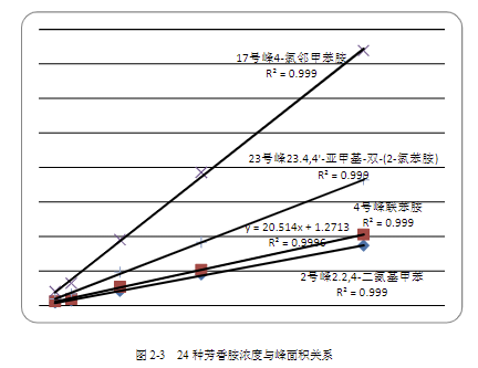 圖 2-3 為選擇 24 種芳香胺中的 4 種,并給出其濃度與峰面積的關系。