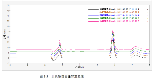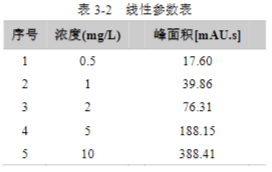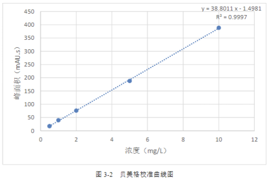 按 GB/T 40898-2021 標準中方法,配制貝美格的標準溶液,質量濃度為 0.5 mg/L、1 mg/L、2 mg/L、5 mg/L 和 10 mg/L 的五個標點,計算相關線性系數。