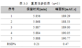 用濃度為 5 mg/L 甲巰咪唑標準溶液,連續進樣 7 針,峰面積和保留時間 RSD 結果如下: