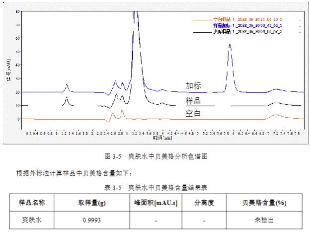 高清資料:圖 3-1 至圖 3-5 高清色譜圖(含基線噪聲放大細節)、不同基質(乳液 / 爽膚水)樣品檢測譜圖;