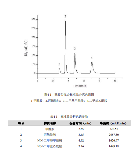 準確稱取 0.100g (精確至 ±0.0001g) 甲酰胺、0.100g (精確至 ±0.0001g) N,N - 二甲基甲酰胺、0.100g (精確至 ±0.0001g) N,N - 二甲基乙酰胺和 0.100g (精確至 ±0.0001g) 丙烯酰胺,用水溶解后全量轉入 100mL 容量瓶中,用水稀釋定容至標線,搖勻。配制成甲酰胺、N,N - 二甲基甲酰胺、N,N - 二甲基乙酰胺和丙烯酰胺濃度分別為 1000mg/L、500mg/L、1000mg/L 和 500mg/L 的酰胺類化合物混合標準貯備液,于 4℃以下冷藏、避光和密封可保存三個月,使用時應恢復至室溫并搖勻。