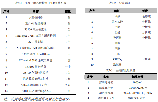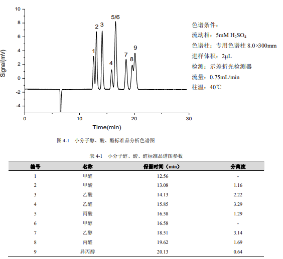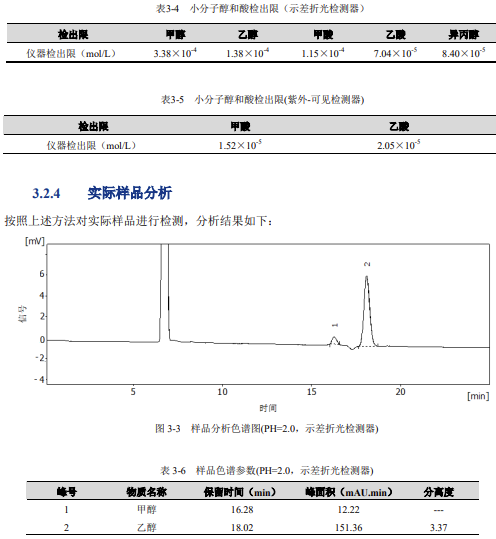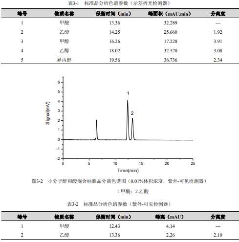 儀器設備與試劑示差折光檢測器為通用型檢測器,可以對所有小分子醇和酸進行檢測,但其靈敏度較低,不能用于痕量檢測;紫外可見檢測器對絕大多數在紫外-可見光的波長范圍內有特征吸收的物質均有較高的檢測靈敏度;兩種檢測器的串聯使用,取長補短,即能實現總量分析,又能完成對甲酸、乙酸等具有代表性的物質進行痕量分析的需求。