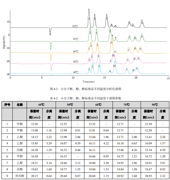 由以上結果可知,小分子醇、酸、醛的分離情況隨著溫度改變而改變,用戶可以根據自身檢測需求,選擇特定溫度進行實驗,從而達到測定某種或者某幾種小分子醇、酸、醛含量的目的。