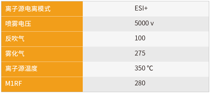 以下參數以依利特科技 EClassical 3200L-MS2 Vertical 9100 三重四極桿質譜儀為例,離子源參數及目標化合物質譜參數見表 2 和表 3。
