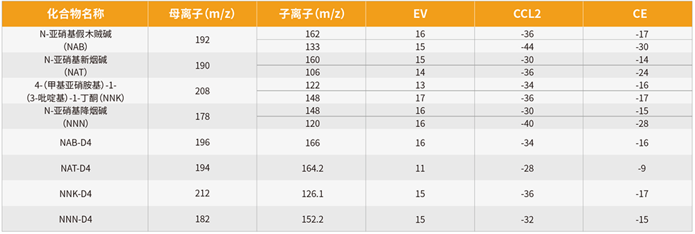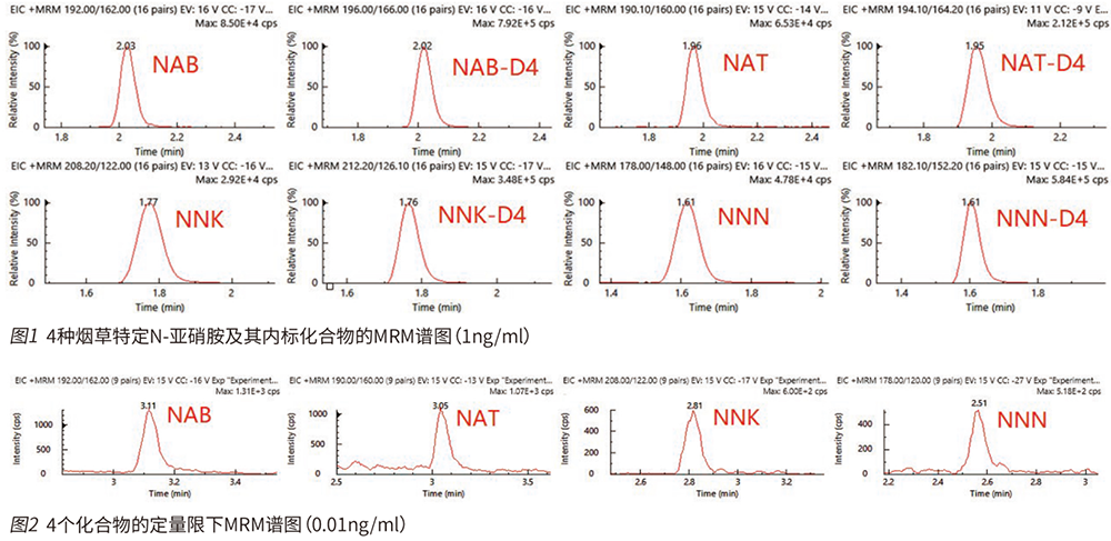 液質聯用技術結合了色譜強大的分離功能和質譜準確的定性功能,能很好的分析痕量水平的 TSNAS,并且前處理方法簡單快速,與傳統的 GC-TEA 方法相比,靈敏度更高、選擇性更強。故本文參考中國煙草總公司企業標準 YO/T 17-2012《卷煙主流煙氣總粒相物中煙草特有 N - 亞硝胺的測定 高效液相色譜 - 串聯質譜聯用法》,采用 EClassical 3200L-MS2 Vertical 9100 液相質譜聯用系統對卷煙主流煙氣中的特有 N - 亞硝胺進行測定,其四種物質的定量限完全滿足并在靈敏度和檢測速度優于標準的檢測需求。