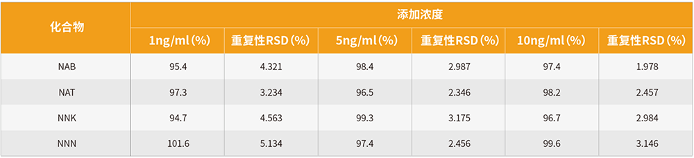 同時考察了 1ng/ml、5ng/ml、10ng/ml 添加濃度下的加標回收率和每個加標濃度下 6 針的重現性測試 (見表 4),實驗結果表明,該方法具有良好的回收率和重現性,完全滿足卷煙主流煙氣中特定 N - 亞硝胺含量的測定。