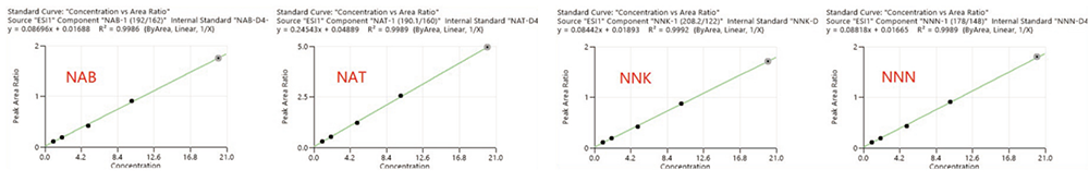 本文采用 EClassical 3200L-MS2 Vertical 9100 三重四極桿液質聯用系統建立了快速、高效可靠的 LC-MS/MS 實驗方法測定卷煙主流煙氣中 4 種特定 N - 亞硝胺,為其測定提供了可靠的高通量檢測手段,同時數據顯示,其重復性和線性均較好,遠遠滿足其標準需求,為用戶的高通量樣品的測定提供可靠的保障。