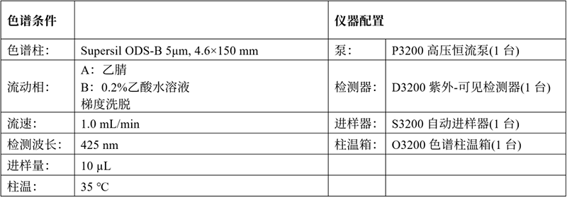 依利特新款的EClassical 3200液相色譜儀搭配經典的Supersil ODS-B色譜柱,對姜黃素樣品進行分析,峰形較好,滿足定性定量分析的需求。