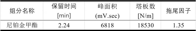 取標準品尼鉑金甲酯約0.0100g,置100mL容量瓶中,加流動相60mL溶解,定容至刻度,制成濃度為0.1mg/mL的標準工作液,濾過,取濾液即可。