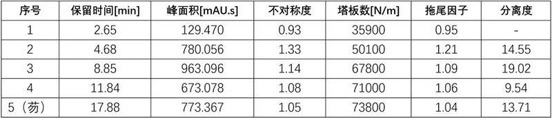 第400針的各峰的分離度與第1針的各峰的分離度比較。從數據看分離度沒有明顯變化,只有5號峰分離度略微變小,主要是因為4號峰樣品變質,檢出新雜質而拖尾造成的。