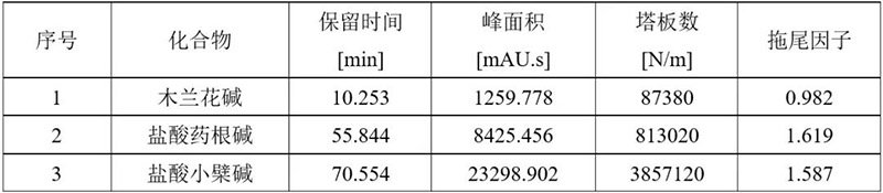 取黃連(黃連)對照藥材0.2g,置具塞錐形瓶中,加入甲醇-鹽酸(100∶1)的混合溶液50mL,密塞,超聲處理(功率250W,頻率40kHz)45分鐘,放冷,搖勻,濾過,取續濾液1mL,置10mL量瓶中,加甲醇至刻度,搖勻,濾過,取續濾液,作為對照藥材參照物溶液。另取木蘭花堿對照品、鹽酸藥根堿對照品、鹽酸小檗堿對照品適量,精密稱定,分別加甲醇制成每1mL含木蘭花堿50μg、鹽酸藥根堿50μg、鹽酸小檗堿90μg的溶液,作為對照品參照物溶液。