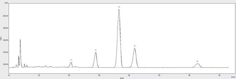 銀杏葉為銀杏科植物銀杏的葉片,含有大量的銀杏黃酮和萜類內脂,是一種具有很高藥用價值的植物。銀杏葉具有斂肺,平喘,活血化瘀,止痛的功效。銀杏葉中的萜類內酯對血小板活化因子(PAF)受體有強大的特異性抑制作用,被認為是有臨床應用前景的天然PAF受體拮抗劑。依利特用新推出的D3270蒸發光散射檢測器匹配熱銷的Supersil ODS2色譜柱,對銀杏葉中萜類內酯的含量進行分析檢測。