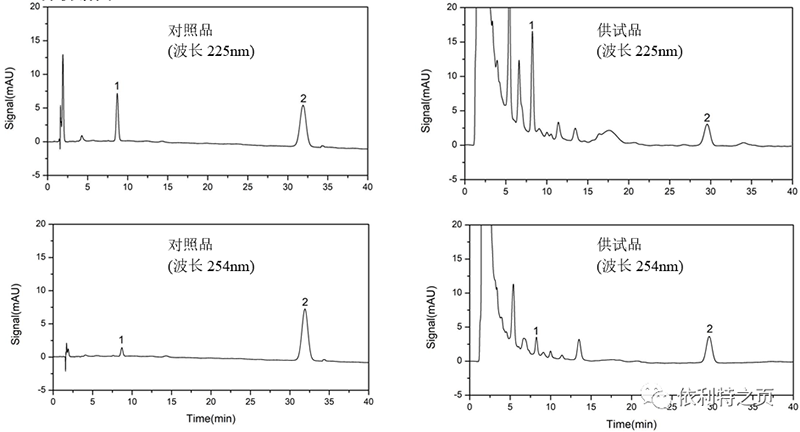 2. 供試品溶液的制備:取重量差異項下的本品,研細,取約0.5g,精密稱定,置具塞錐形瓶中,精密加入甲醇50mL,稱定重量,超聲處理(功率250W,頻率70kHz)40分鐘,再稱定重量,用甲醇補足減失的重量,搖勻,濾過。精密量取續濾液10mL(剩余溶液備用),加置中性氧化鋁柱(200~300目,4g,柱內徑為1.5cm)上,用甲醇30mL洗脫,收集洗脫液,濃縮至約2mL,用適量甲醇轉移至5mL量瓶中,加甲醇稀釋至刻度,搖勻,濾過,取續濾液,即得。
