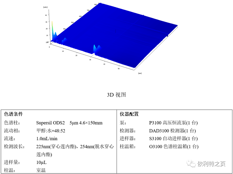 系統適用性要求:理論板數按穿心蓮內酯和脫水穿心蓮內酯峰計算均應不低于2000。